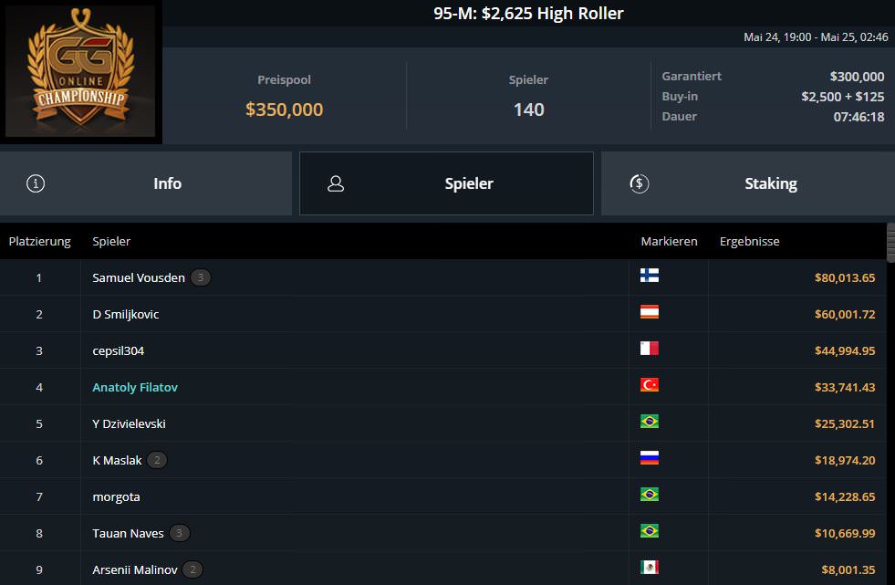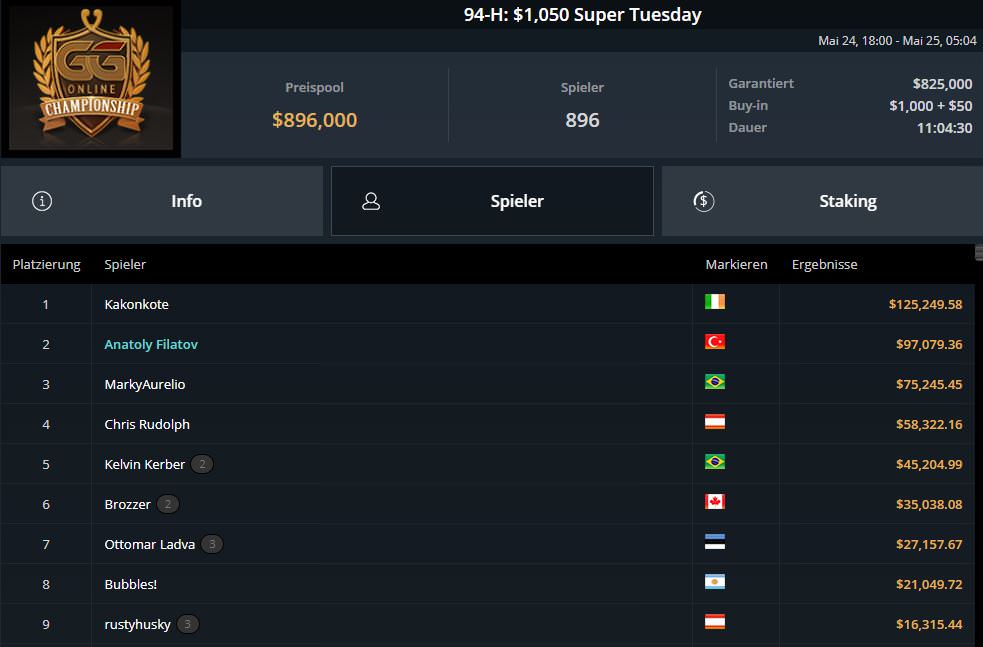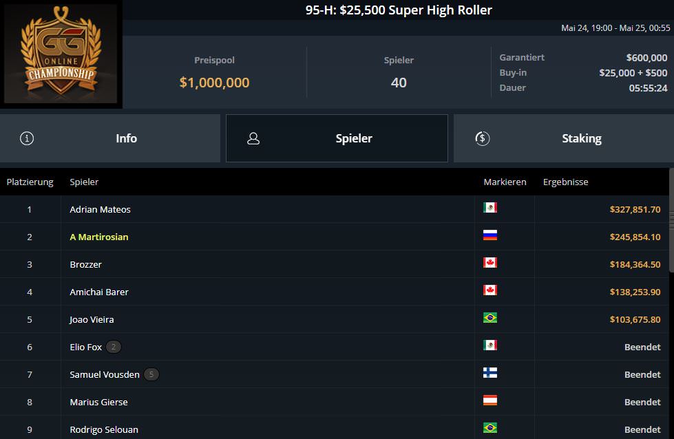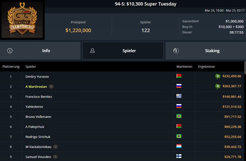 Abräumer des Tages war der Russe Artur Martirosian. Auch ihm blieb ein Turniersieg verwehrt, aber nachdem er das $25.500 Super High Roller (95-H) hinter Adrian Mateos ($327.851,70) auf Platz zwei abgeschlossen hatte, erreichte er auch noch das Heads-up beim $10.300 Super Tuesday (94-S). Hier unterlag er nach einem Deal dem Weißrussen Dmitry Yurasov ($232.459,66) und räumte weitere $263.367,17 ab.