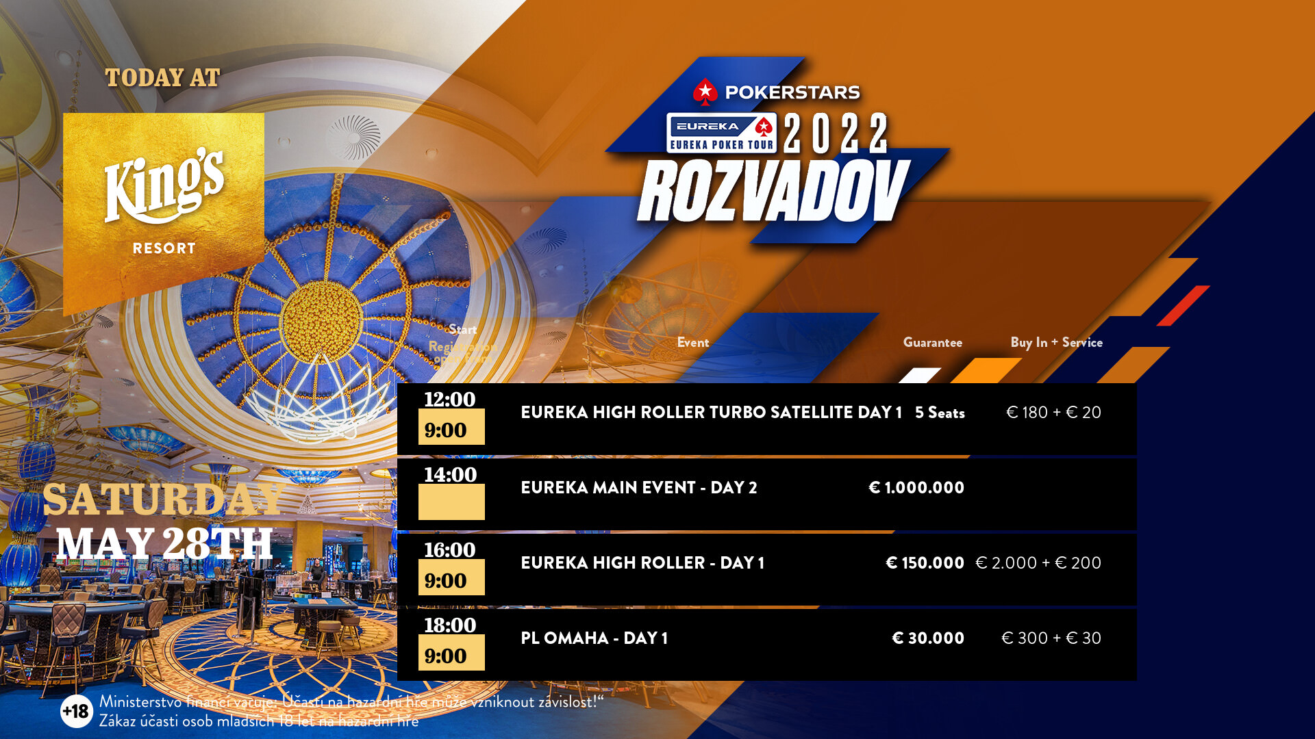Um 12 Uhr startet zunächst ein €200 Satellites mit fünf garantierten Tickets zum auf zwei Spieltage angesetzten €2.200 Eureka High Roller mit €150.000 garantiert, das um 16 Uhr beginnt.