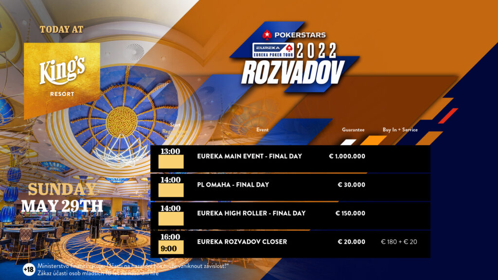 Um 16:00 Uhr wird dann noch das Eureka Closer mit €180+20 Buy-In und €20.000 Garantie veranstaltet und das Ende des Eureka-Stopps in Rozvadov besiegelt.