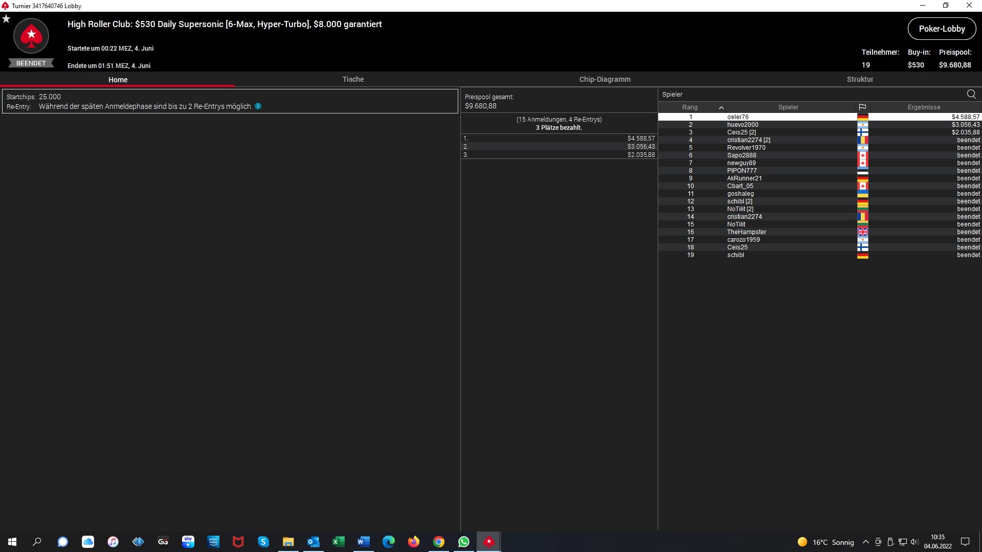 Das $530 Daily Supersonic lockte nur 19 Spieler an und so ging es um $9.680. Den Sieg und $4.588 schnappte sich der Deutsche „oeler“.