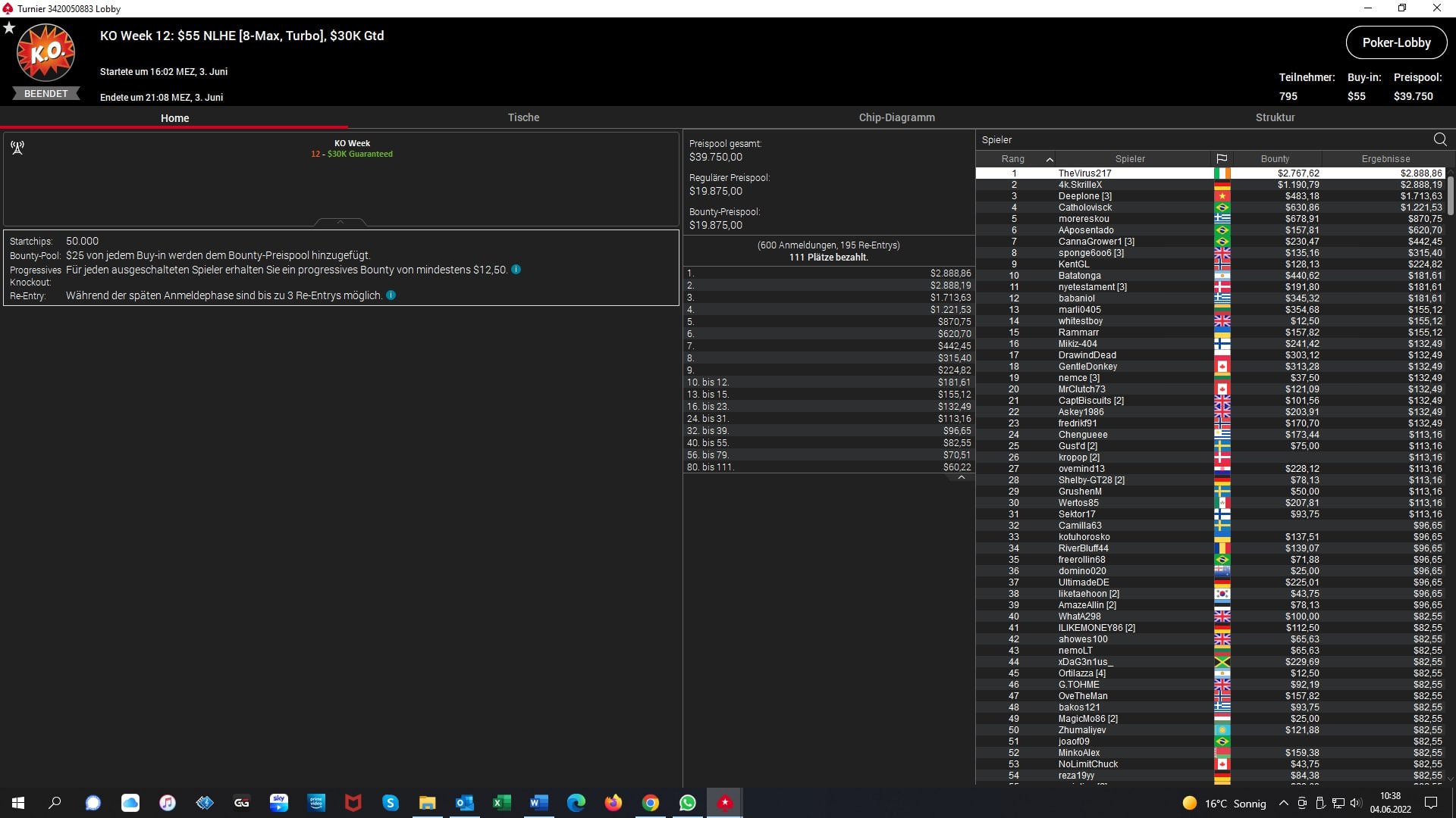Platz 2 – $55 NLHE 8-Max Turbo – „4k.SkrilleX“ (GER) – $2.888 + $1.190 Bounties