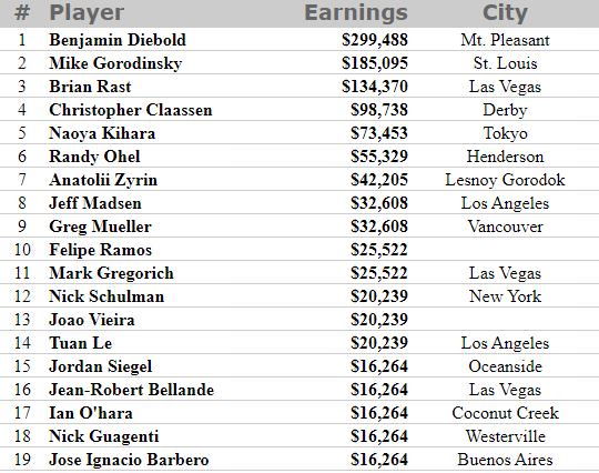 Diebold wurde sein erstes WSOP-Bracelet mit $299.488 Prämie versüßt, Gorodinsky, der schon zwei Bracelets sein Eigen nennt, bekam diesmal als Runner-up $185.095 ausbezahlt.