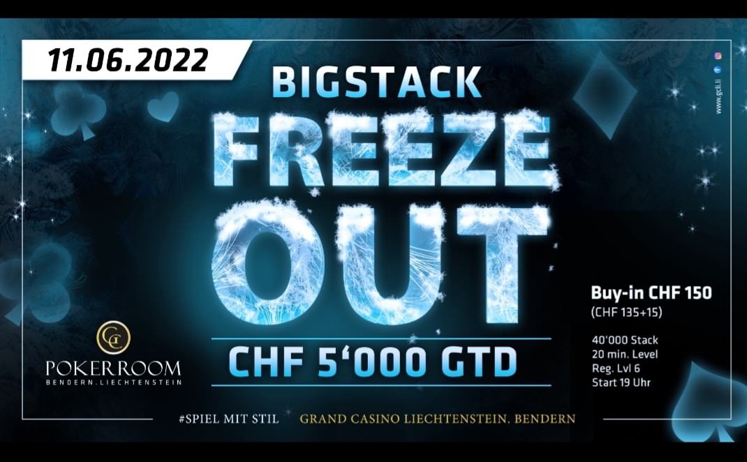 Samstag wird im GC Pokerroom ab 19:00 Uhr das CHF 120+10 Big Stack Freezeout Event gespielt, bei dem ein Preisgeld von CHF 5.000 garantiert wird. Man startet mit 40.000 in Chips und jeder Level dauert 20 Minuten. Die Late-Registration ist für sechs Levels geöffnet.