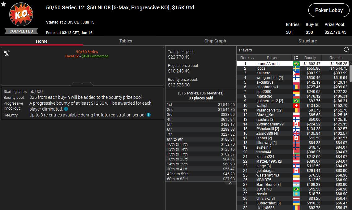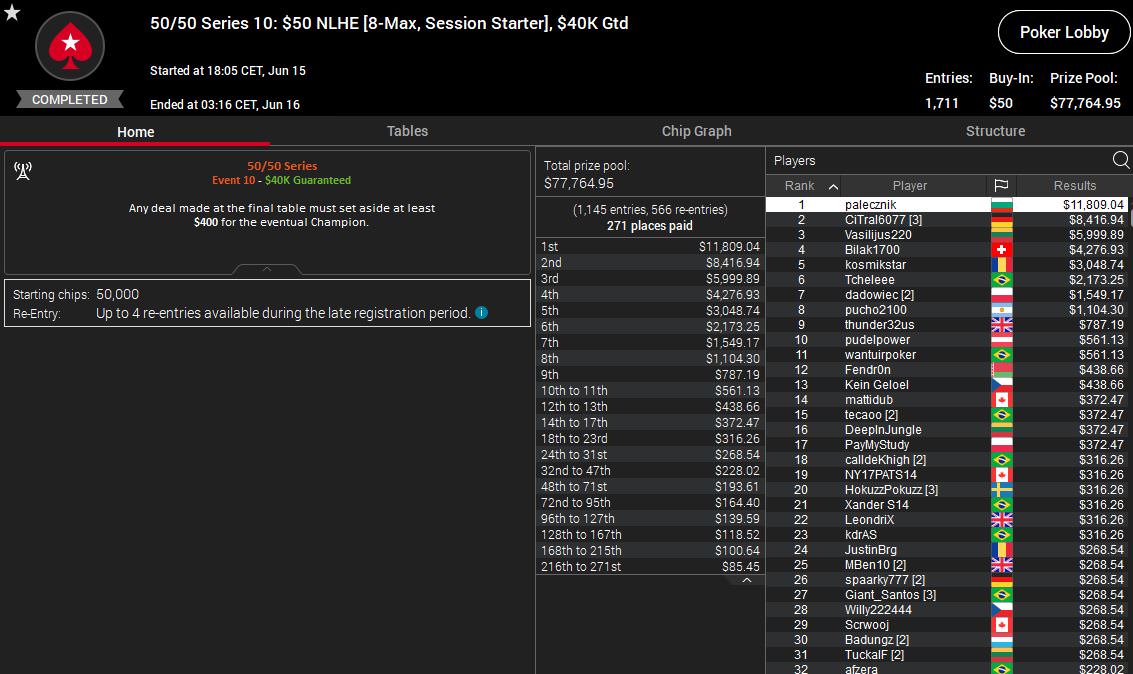 Bei der 50/50 Series verpasste CiTral6077 nur haarscharf den Turniersieg beim $50 NLHE Session Starter. Insgesamt wurden hier $77.764,95 ausgespielt, davon bekam der Deutsche als Runner-up $8.416,94 gutgeschrieben. Bilak1700 aus der Schweiz belegte Platz vier für $4.276,93 Preisgeld.