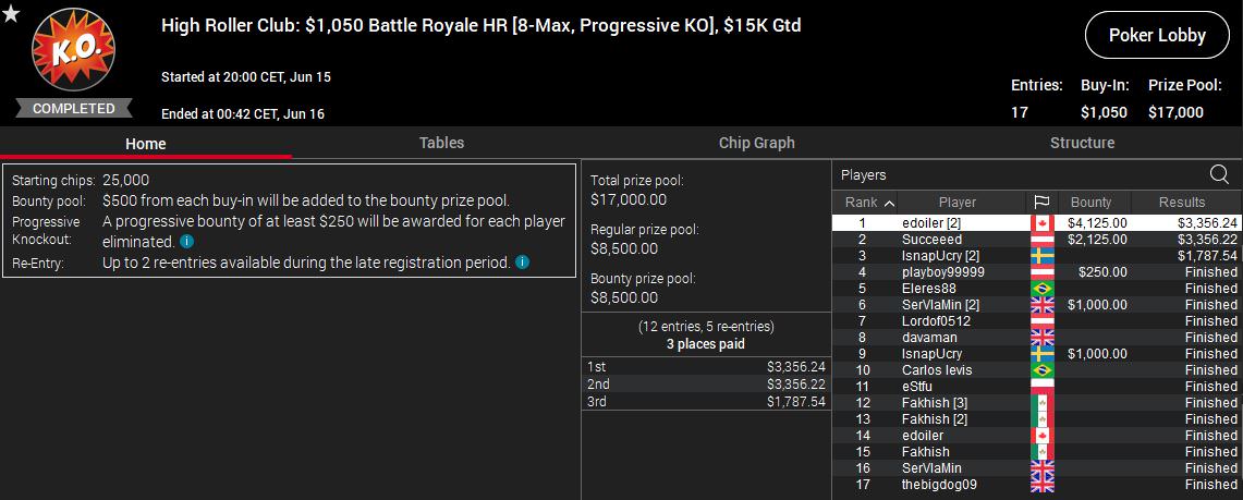 Jakob Succeeed Miegel musste sich beim $1.050 Battle Royale HR mit Platz zwei für $3.356,22 plus $2.125 begnügen. Hier schied Prinz an der Bubble auf Platz vier aus, sodass nur $250 in Bounties zu Buche schlugen.