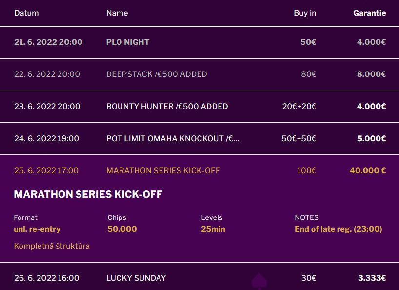 Im Card Casino Bratislava kommen Turnier-Pokerspieler auch in dieser Woche wieder täglich auf ihre Kosten. Das große Highlight wird am Samstag, dem 25. Juni, mit dem Marathon Series Kick-Off gespielt.