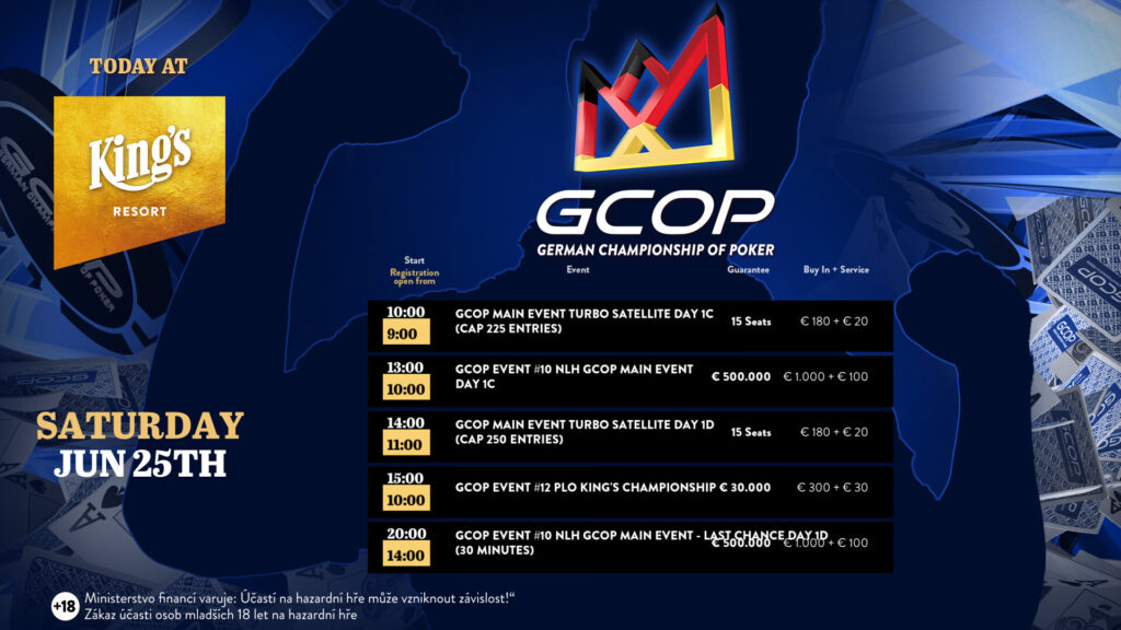 Im King’s Resort findet die German Championship of Poker (GCOP) statt und das Main Event hatte gestern seinen zweiten Spieltag. Zudem gab es noch Event #11, ein NLH Turbo Bounty Hunter Tagesturnier.