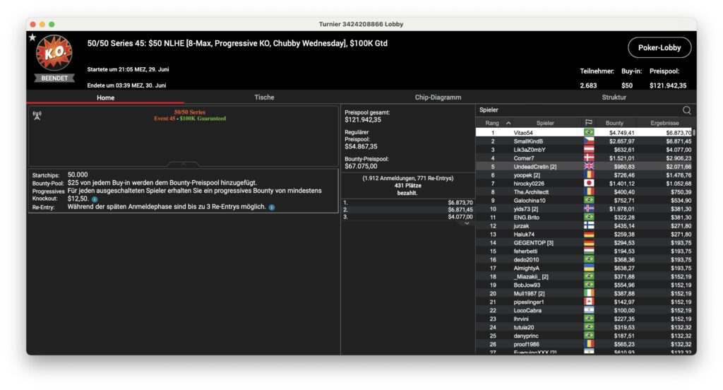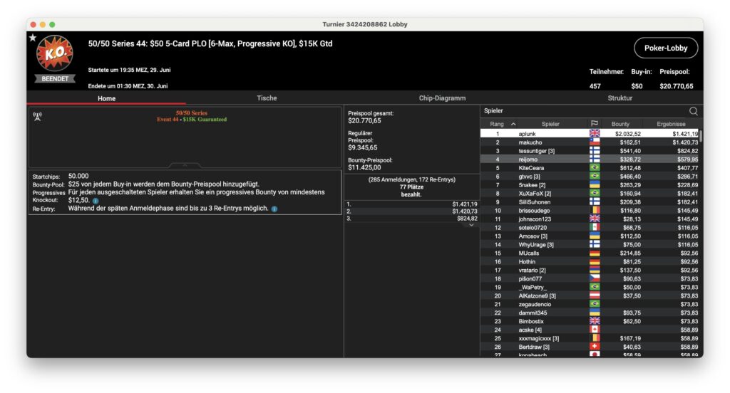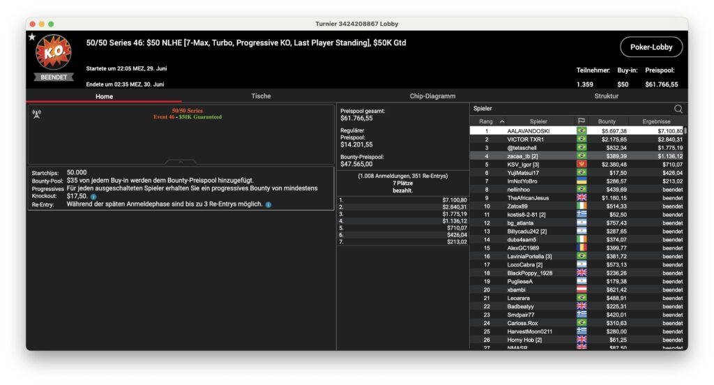 Bei der 50/50 Series gewannen „crazybombs“ Event 43 für $11.210, „aplunk“ Event 44, ein 5Card PLO PKO, für $2.032 + $1.421, „Vitao54“ Event 45, ein PKO, für $4.749 + $6.873 und „AALAVANDOSKI“ Event 46, ein Turbo PKO Last Man Standing, für $5.697 + $7.100.