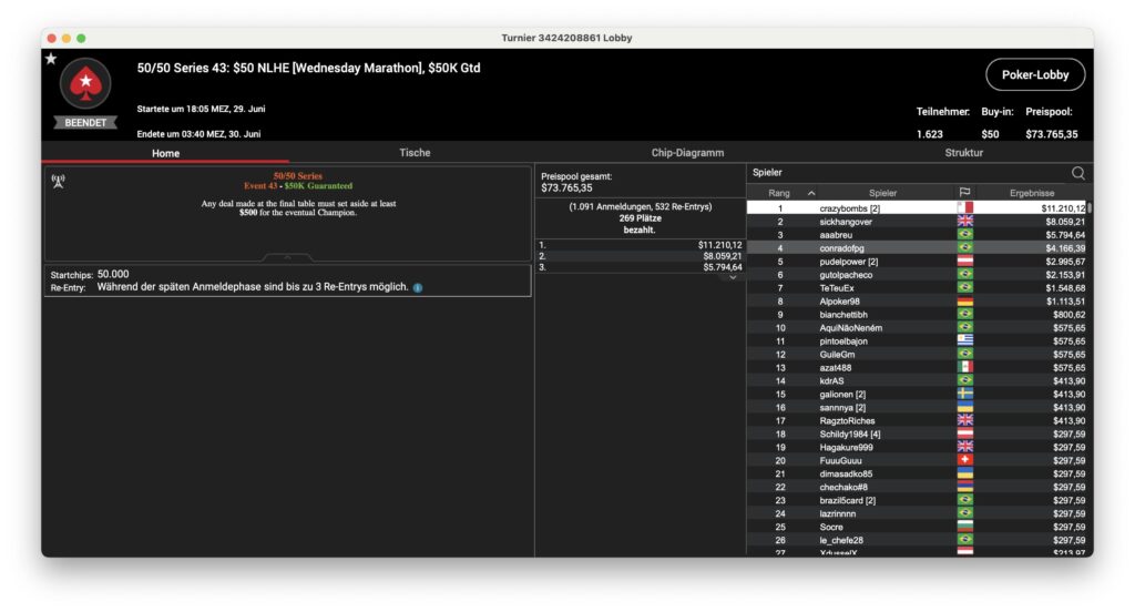 Nicht viel los war am Mittwochabend im High Roller Club auf PokerStars. Die 50/50 Series hatte ihren vorletzten Tag. Bei beiden konnten die DACH-Spieler keinerlei Erfolge feiern.