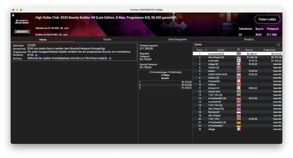 Michael „munchenHB“ Telker konnte sich die Spätausgabe des $530 Bounty Builder HR sichern und aus dem $11.500 Preispool $2.484 + $2.270 schnappen.