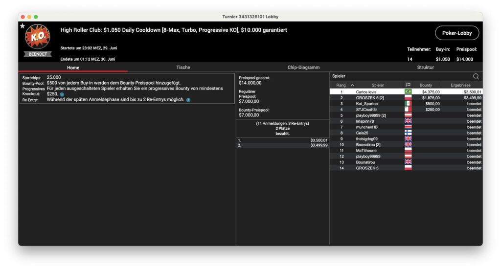 Und das $1.050 Daily Cooldown ging an Carlos „Carlos levis“ Ribeiro aus Brasilien, der $4.375 mit Bounties und $3.500 mit seinem Sieg erringen konnte. 14 Entries kamen in dem Turnier zustande, $14.000 lagen im Preispool.