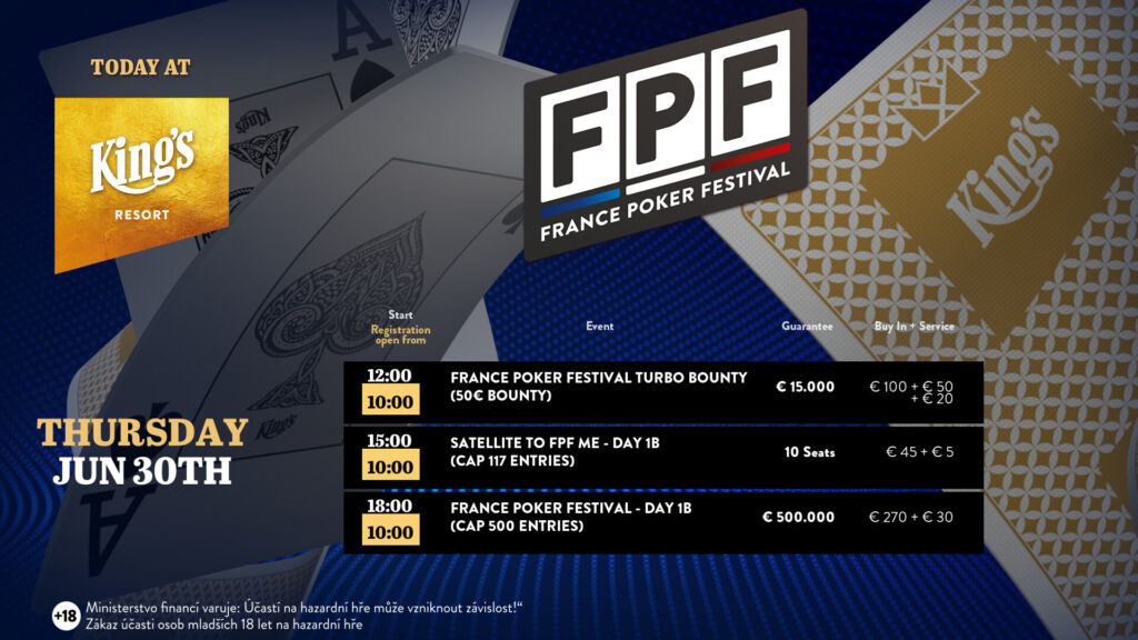 Das €270+30 France Poker Festival (FPF) im King’s Resort ist angelaufen. Der erste Startflight wurde gespielt und die ersten Entries in das Multiflight-Event aufgeladen.