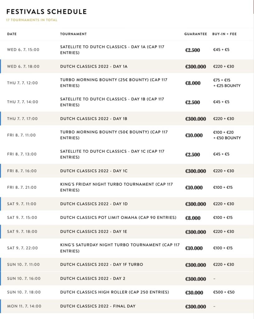 Los geht es am Mittwoch um 15:00 Uhr mit einem Satellite für das Dutch Classics Main Event, bei dem sich Tickets für schmale €45+5 erspielen lassen. 10 werden in diesem Turnier garantiert.