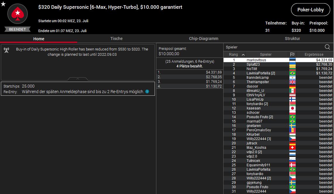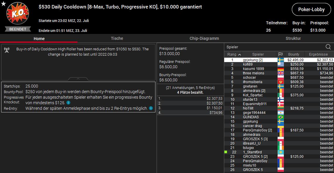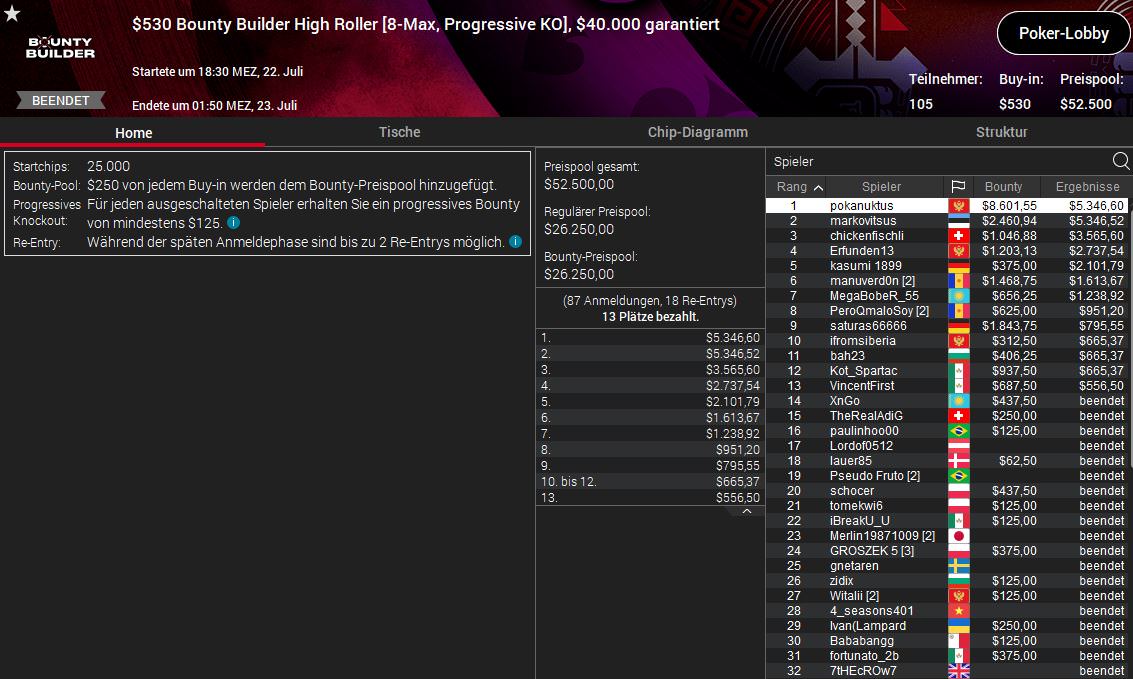 Für das beliebte $530 Bounty Builder High Roller meldeten gestern87 Pokerspieler, die den Preispool durch 18 Re-Entries auf $52.500 hochschraubten. Am Final Table belegte chickenfischli ($3.565,60/$1.046,88) aus der Schweiz Platz drei, kasumi 1899 ($2.101,79/$375) Platz fünf und saturas66666 ($985,55/$1.843,75) Platz neun. Den Sieg holte pokanuktus ($5.346,60/$8.601,55) aus Montenegro.
