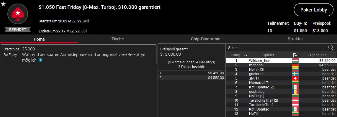 Beim $1.050 Fast Friday gab es nur 13 Entries, sodass die $13.000 im Preispool unter den letzten zwei Spielern aufgeteilt wurden. Der Ungar Wildace_hun ($8.450) setzte sich am Ende vor monopol ($4.550) durch.