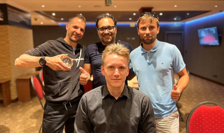 Beim €90+10 am späten Abend war die Beteiligung mit 25 Spieler dann aber ziemlich übersichtlich, ausgelassene Freude gab es trotzdem. Die letzten drei Spieler einigten sich auf einen Deal für je €645 Preisgeld und die Trophäe in Form eines Dimants ging an Peter Fricker.