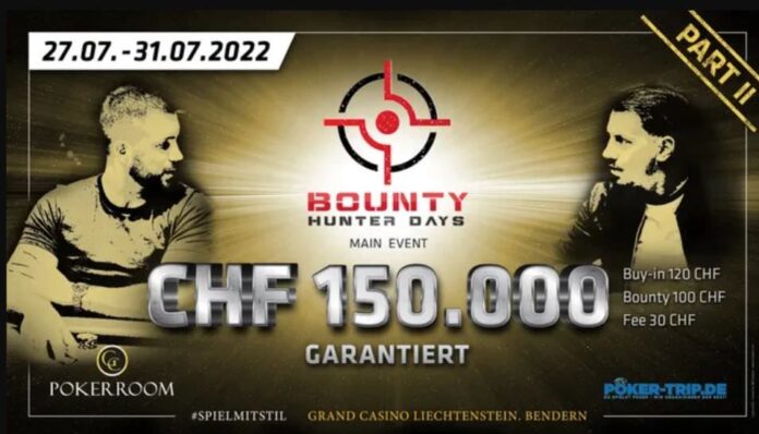 Am kommenden Wochenende ist es wieder so weit. Bei den Bounty Hunter Days II powered by Poker-Trip.de gibt es allein beim CHF 120+100+30 Main Event mindestens CHF 150.000 zu gewinnen, dazu warten auf die Spieler diverse Side Events.