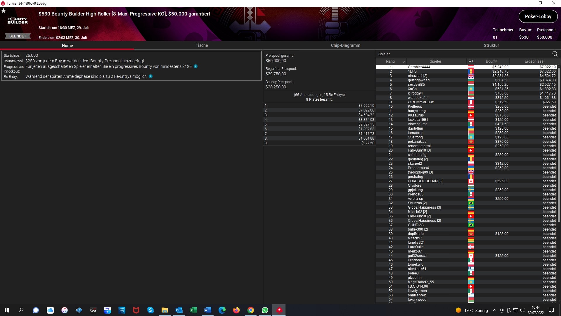 Beim größten High Roller Event des Tages, dem $530 Bounty Builder High Roller gab es am Freitag einen Sieg für Deutschland. Hier konnte sich Christian „Gambler4444“ Nolte (GER) gegen 80 Gegner durchsetzen und $7.022 + $6.249 Bounties gewinnen.