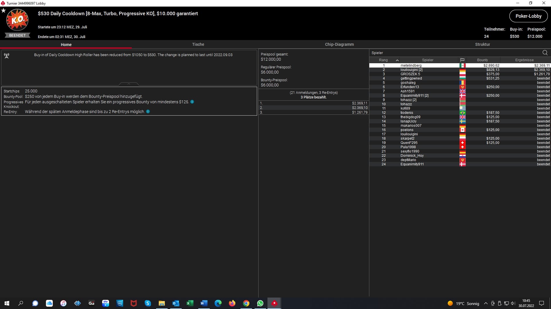 Fast hätte es beim $530 Daily Cooldown einen weiteren Sieg für die DACH-Gemeinde gegeben. Da musste sich der Deutsche „louilouigini“ erst im Heads-Up „metalindberg“ (MEX/USA) geschlagen geben und wurde mit $2.369 + $828 Bounties belohnt.