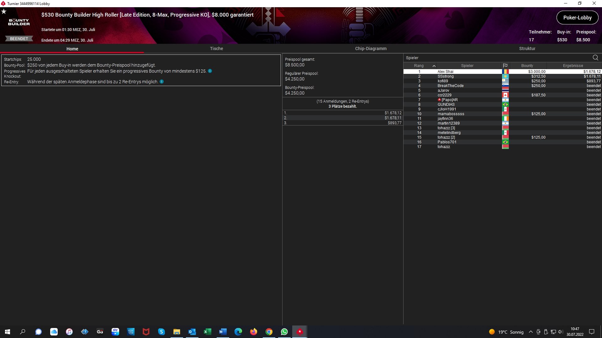 Außerdem gewann noch der Rumäne „Alex Shai“ das $530 Bounty Builder High Roller Late-Edition Turnier für $1.678 + $3.000 Bounties.