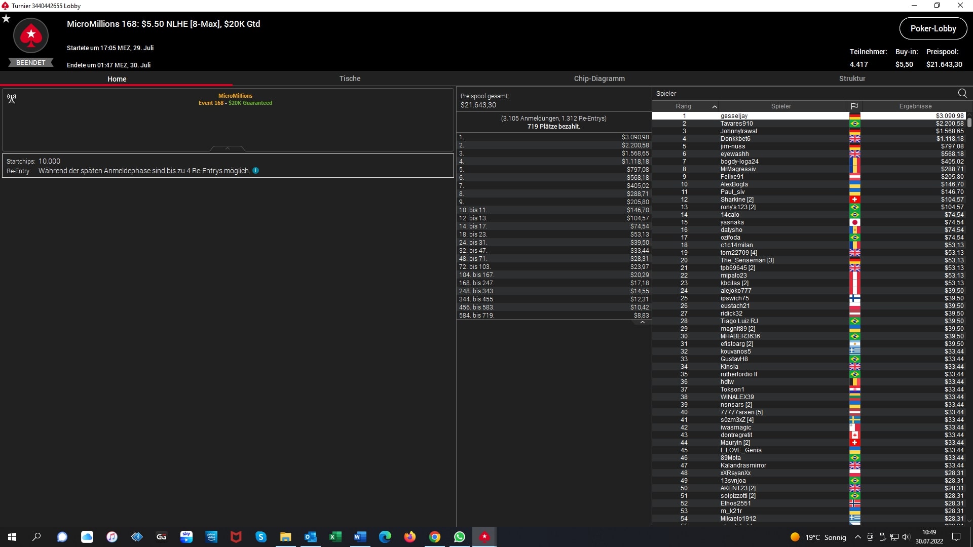Am Tag 13 der Micro Millions holten sich die DACH-Grinder zweimal Gold und einmal Bronze. Das $5,50 NLHE Event #168 konnte der Deutsche „gesseljay“ für sich entscheiden und $3.090 gewinnen. Platz 3 ging hier ebenfalls nach Deutschland und zwar an „Johnnytrawat“ für $1.568. Dann triumphierte noch „zappalution“ aus Deutschland beim $5,50 NLHE Event #176 und kassierte $2.094.
