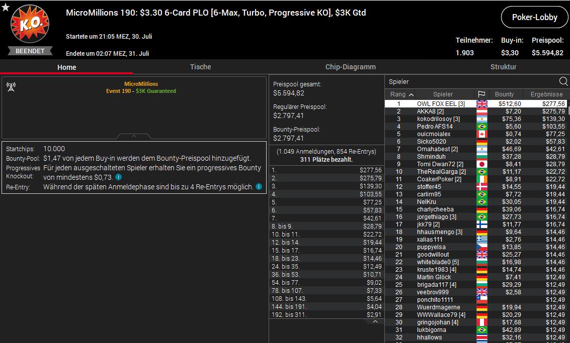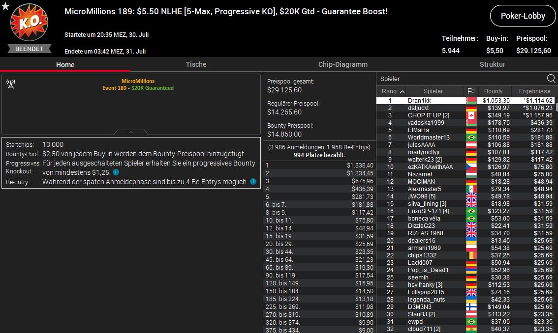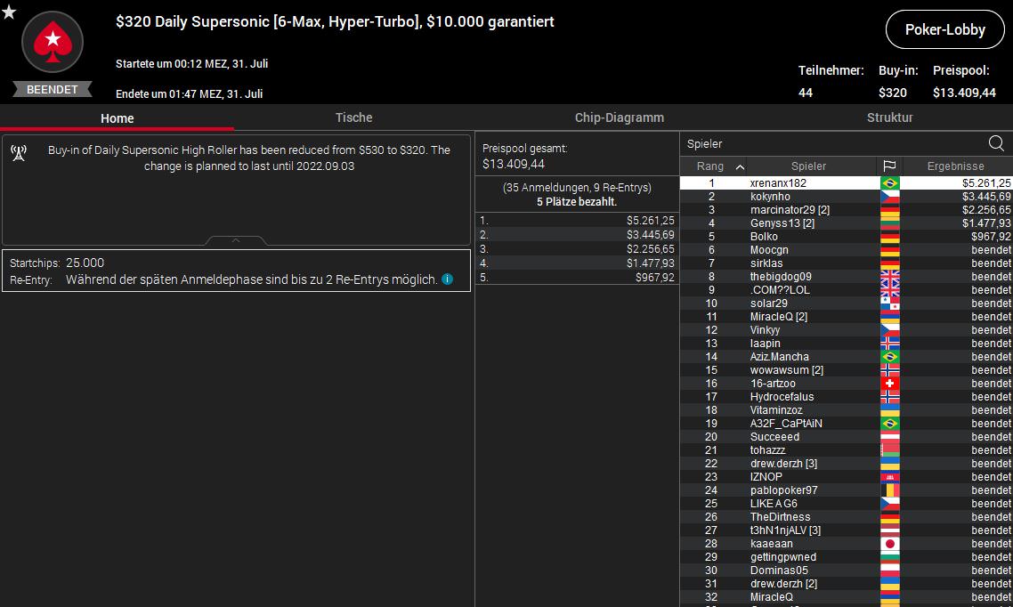 Außerdem schafften zwei Deutsche den Sprung ins Geld beim $320 Daily Supersonic. Insgesamt lagen hier $13.409,44 im Preispool, davon gingen $2.256,65 an marcinator29 als Dritter und $967,92 an Bolko als Fünfter.