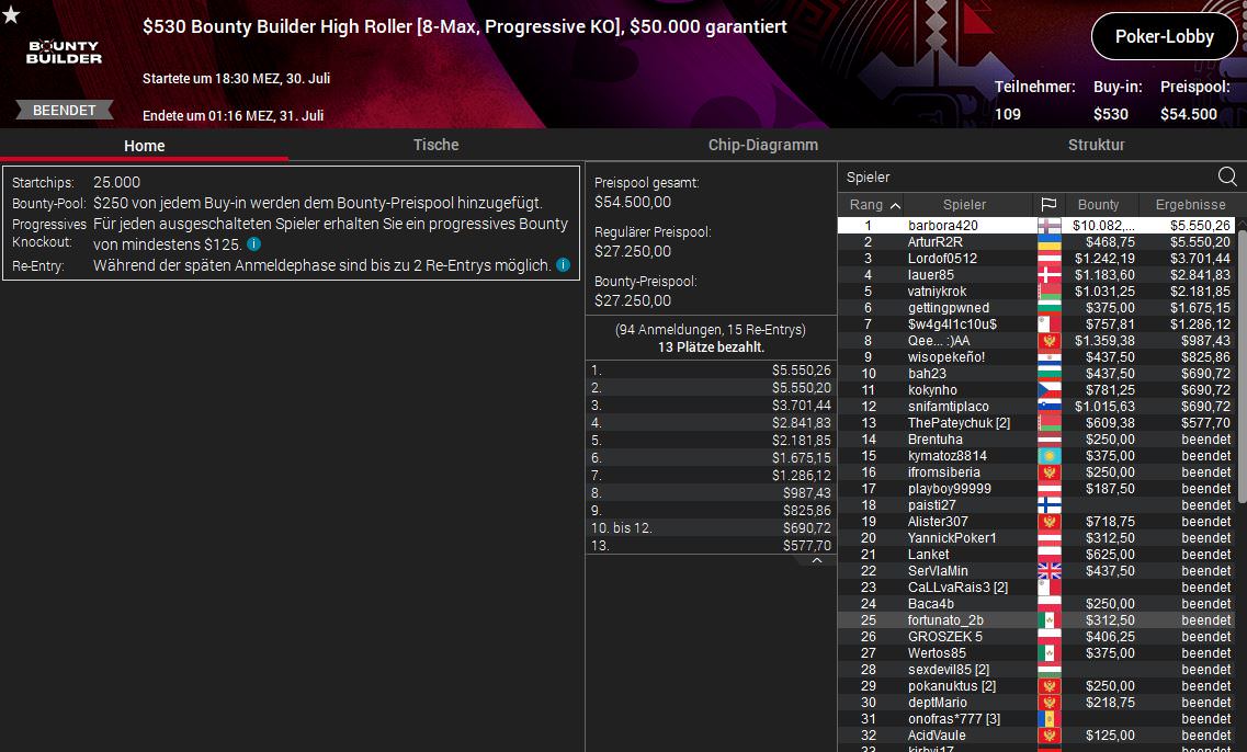 Aus deutschsprachiger Sicht gab es im High-Roller-Bereich ein paar gute Ergebnisse. Lordof0512 aus Österreich beendet das $530 Bounty Builder High Roller auf Platz drei für $3.701,44 Preisgeld plus $1.242,19 an Bounties. Insgesamt wurden $54.5009 ausgespielt, den Sieg holte barbora420 von den Faröer Inseln für $5.550,26 plus $10.082,01.