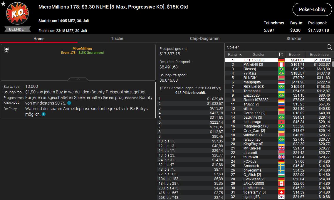 | MM178: $3,30 NLHE PKO | 1 | .E: T 1503 (GER) | $1.039,48/$641,67 |