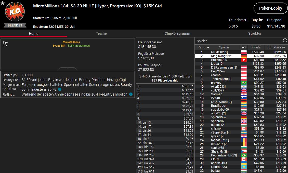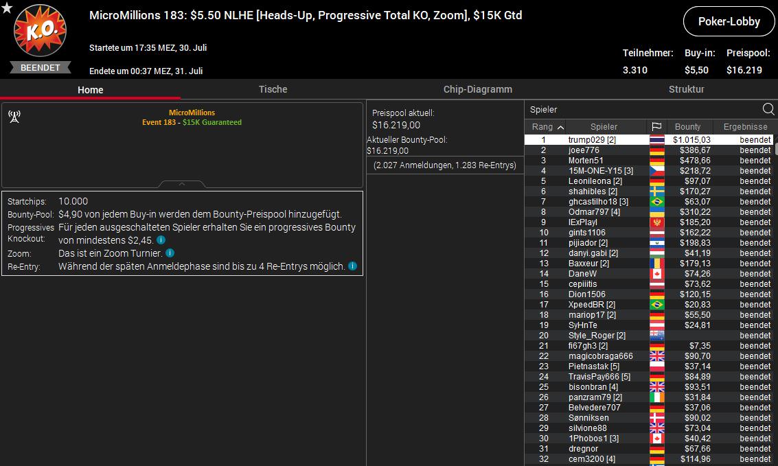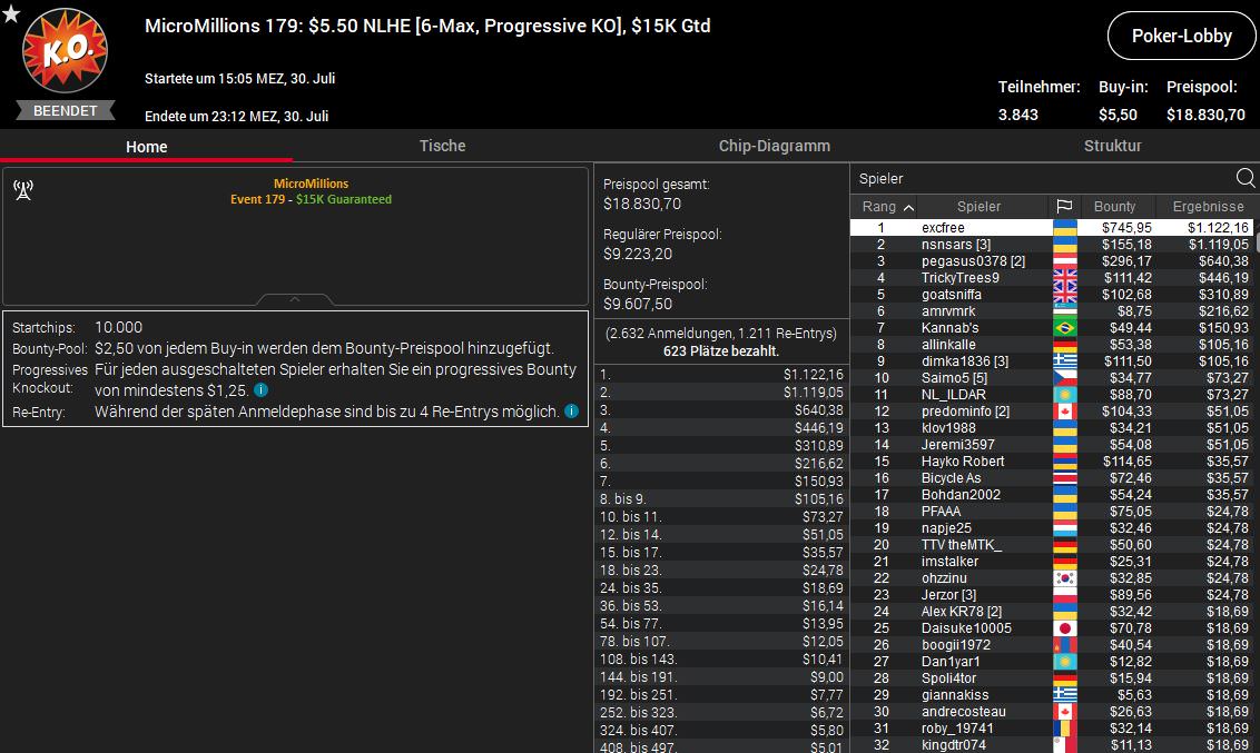 Bei den MicroMillions waren die deutschsprachigen Spieler am Samstag ebenfalls erfolgreich und feierten zwei Turniersiege. E: T 1503 gewann ein $3,30 NLHE PKO (Event 178) für $1.039,48 plus $641,67, Gillo1971 ein $5,50 6+ Hold’em für $675,31.