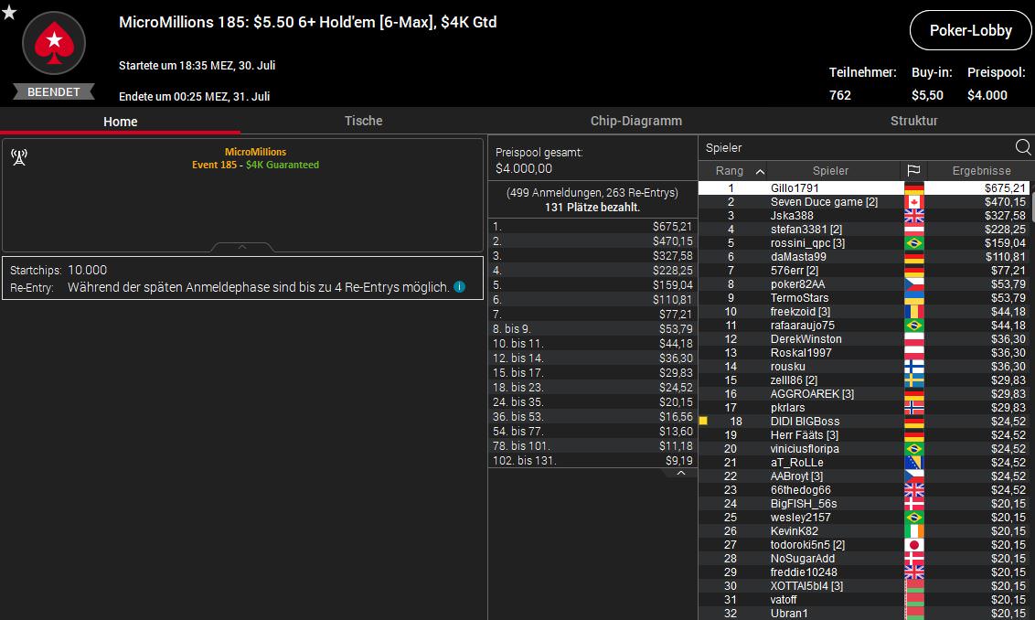 | MM185: $5,50 6+ Hold’em 6-Max | 1 | Gillo1971 (GER) | $675,21 |