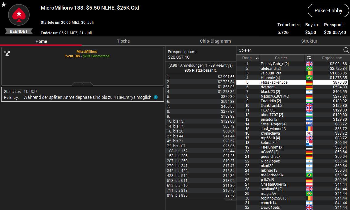 | MM188: $5,50 NLHE | 5 | FlitzeKackenJoe (GER) | $870,30 |