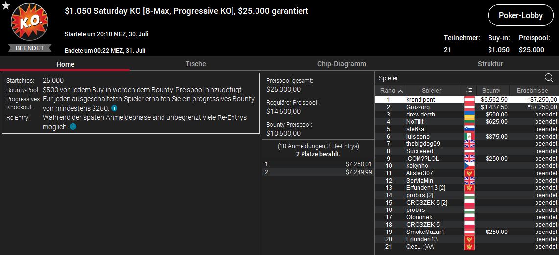 Beim $1.050 Saturday KO wurden die garantierten $25.000 ausgespielt und hier erreichten zwei in Österreich lebende Spieler das Heads-up. Den Sieg holte letztlich krendipont ($7.250/$6.562,50) vor Grozzorg ($7.250/$1.437,50).