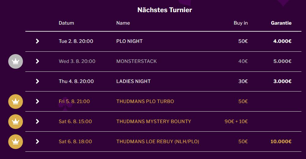 Am Freitag, dem 5. August, wird um 21 Uhr das €50 PLO Turbo gespielt. Am Samstag, dem 6. August, wird es bereits am Nachmittag um 15 Uhr spannend mit dem €100 Mystery Bounty, ehe um 18 Uhr das €50 LOE Rebuy mit €10.000 garantiert auf dem Programm steht.