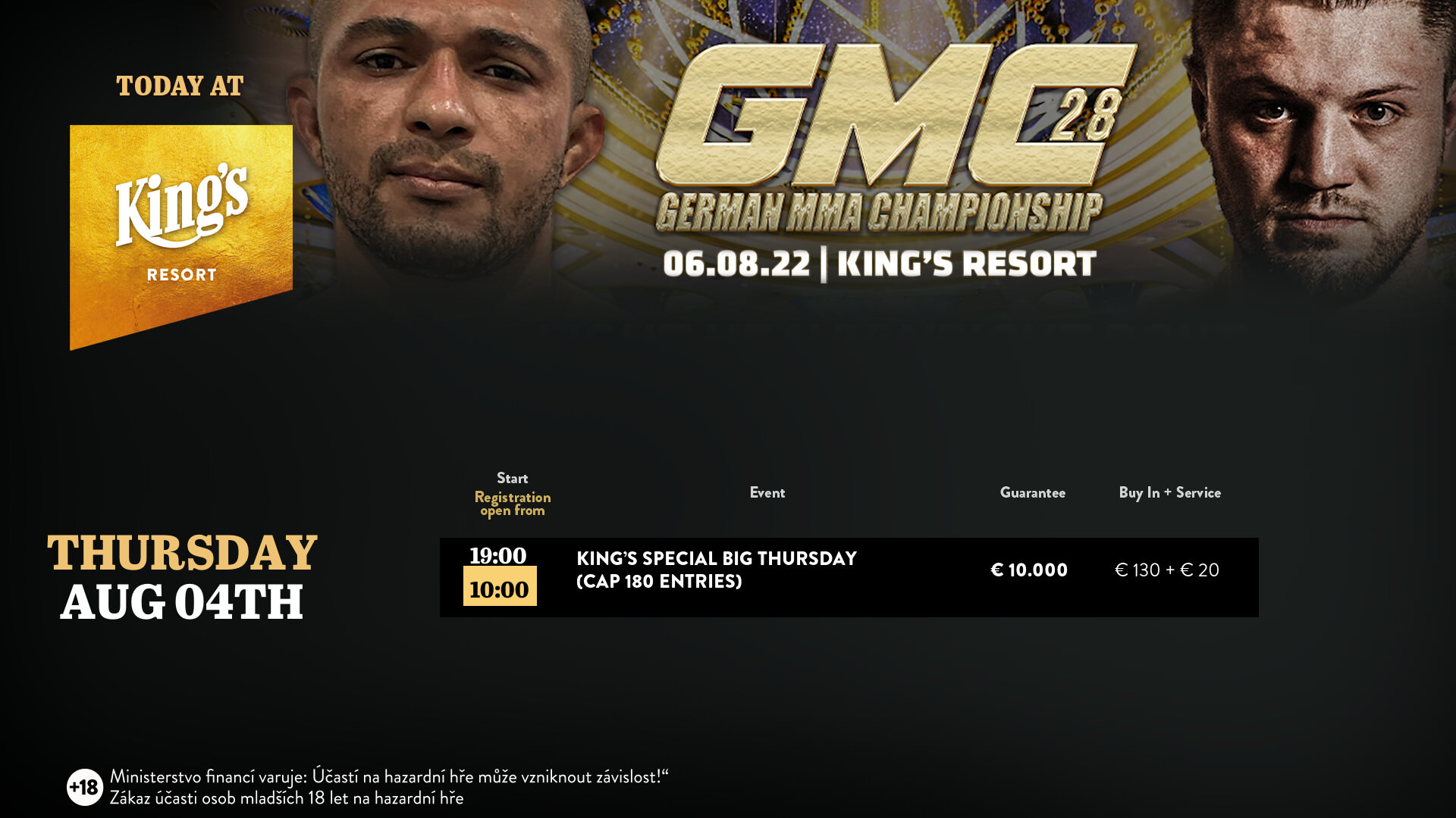 Pokertechnisch steht uns im King’s Resort ausnahmsweise eine ruhige Woche bevor, denn am kommenden Samstag ist erstmals die „German MMA Championship“ in der größten Live-Pokerarena Europas zu Gast.
