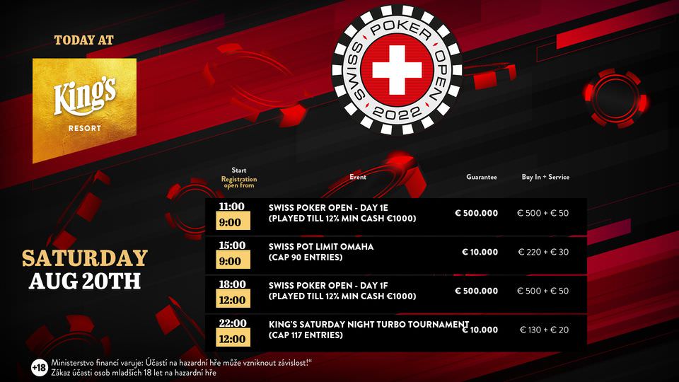 Um 15 Uhr startet zusätzlich noch das €220+30 Swiss Pot Limit Omaha mit €10.000 garantiert und am späten Abend um 22 Uhr wird das King’s Saturday Night Turbo mit €10.000 garantiert gespielt.