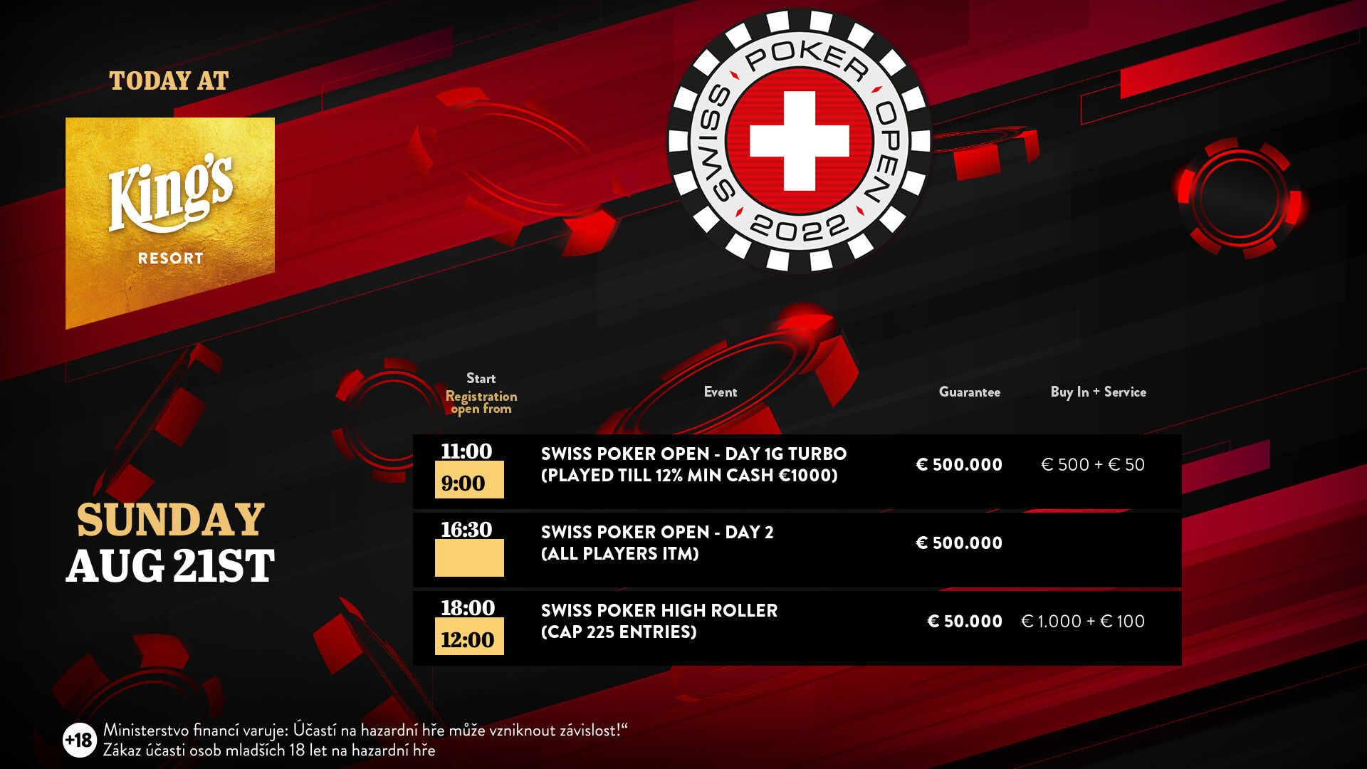Heute wird neben Tag 2 beim Main Event (ab 16:30 Uhr) auch noch das €1.000+100 Swiss Poker High Roller gespielt. Los geht es um 18 Uhr, die maximale Anzahl Entries liegt bei 225 und beim garantierten Preispool sind mit €50.000 veranschlagt.