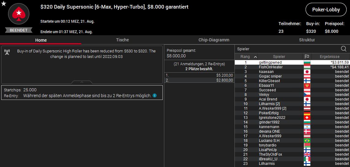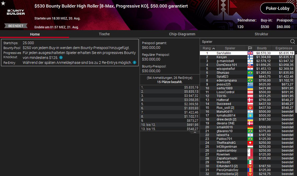 Am Freitag wurden bei dem beliebten PKO-Turnier bei 79 Entries die garantierten $40.000 ausgespielt, gestern lagen dann bei 120 Entries glatte $60.000 im Preispool. Die deutschsprachigen Spieler mischten diesmal leider nicht vorne mit, LoosControl ($691,95/$500) und T0X16- ($691,95/$531,25) erzielten mit den Plätzen elf und zwölf die Top-Ergebnisse. Den Sieg für $5.835,19 plus $8.570,30 holte der Brite SerVlaMin.