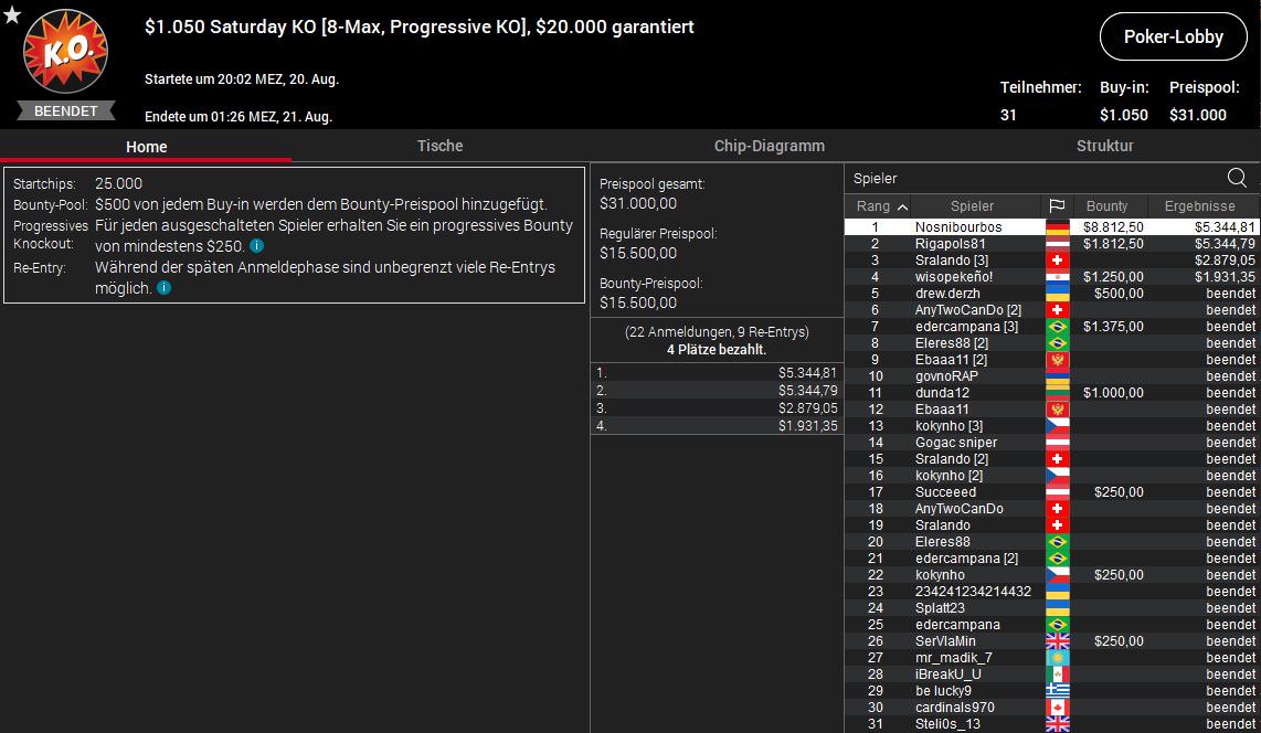 Gut lief es gestern für Nosnibourbos aus Deutschland gleich zweimal. Zunächst gewann er das $1.050 Saturday KO für $5.344,81 Preisgeld plus $8.812,50 und ein paar Stunden später sprang beim $530 Bounty Builder HR Late Edition noch Platz zwei für $2.751,26 plus 875 heraus.