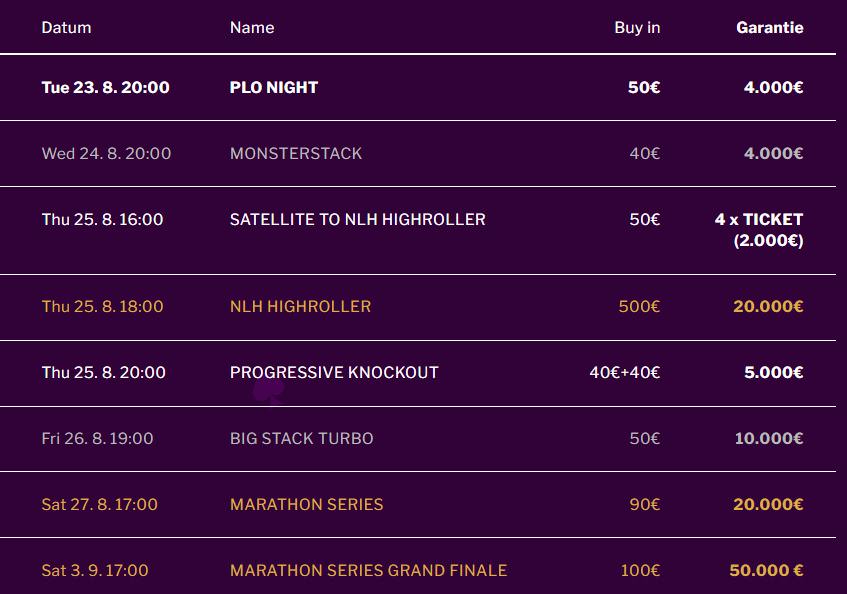 Es ist der letzte von insgesamt acht Vorläufen seit Anfang Juli. Das Marathon Series Grand Finale wird eine Woche später, am 3. September, gespielt. Dann geht es beim €100 Buy-in um garantierte €50.000 und wer sechs der Vorläufe gespielt bekommt das Ticket zum Finale gratis.
