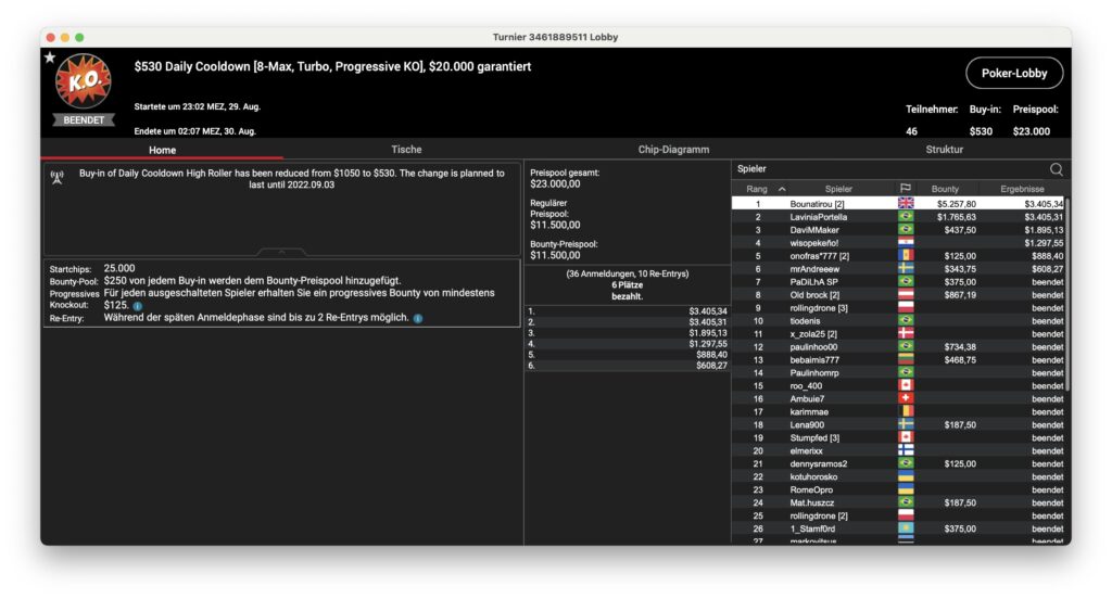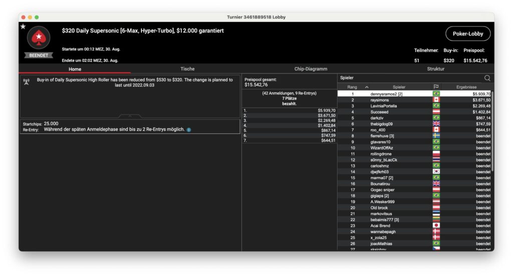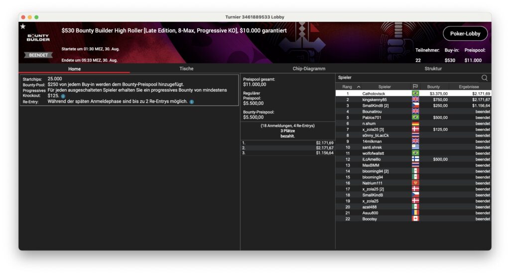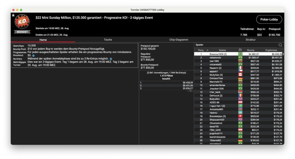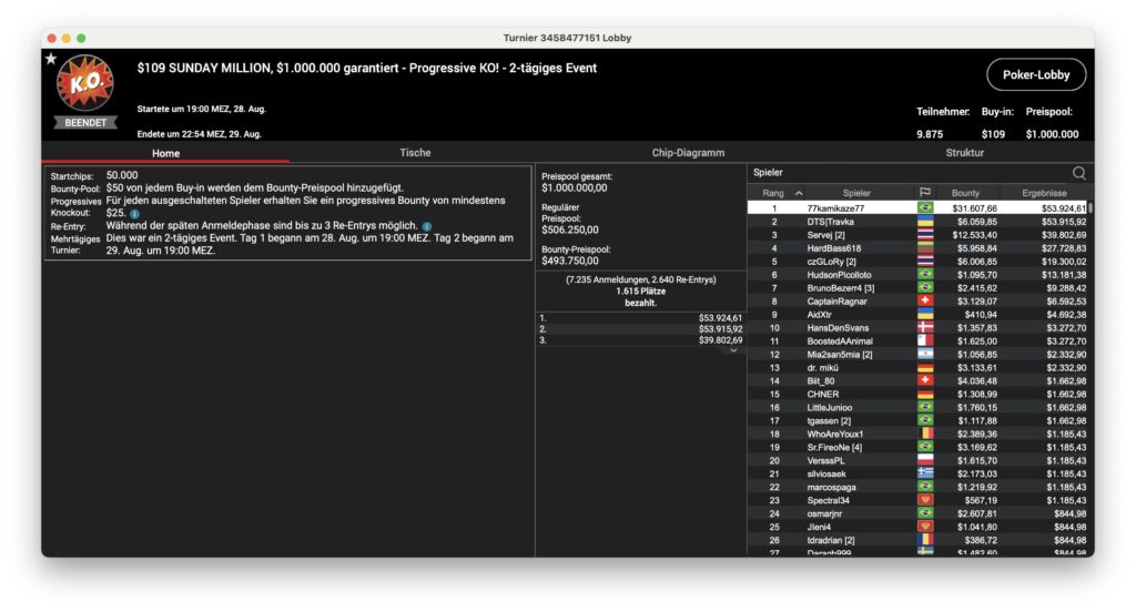 Ansonsten waren die brasilianischen Spieler am Montag sehr erfolgreich. Das Sunday Million ging an „77kamikaze77“ aus dem Land mit der grün-gelben Flagge, der $31.607 + $53.924 aus dem Turnier mitnahm. „dennysramos2“ holte sich das $320 Daily Supersonic für $5.939, „Cathlovisck“ gewann die Late-Edition des Bounty Builder für $3.375 + $2.171.