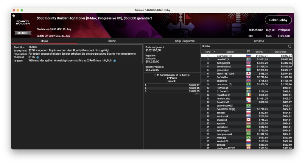 Das reguläre Bounty Builder HR gewann der Slowene „Scarmak3r“ mit der zweiten Bullet. 205 Entries traten hier an. Der Sieg wurde mit $13.027 + $8.812 belohnt.