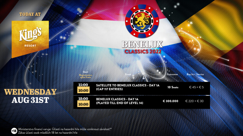 Um 18:00 Uhr startet dann das Main Event der Benelux Classics, das am Mittwoch bis ins Level 14 gespielt wird. €300.000 werden in diesem Turnier garantiert.