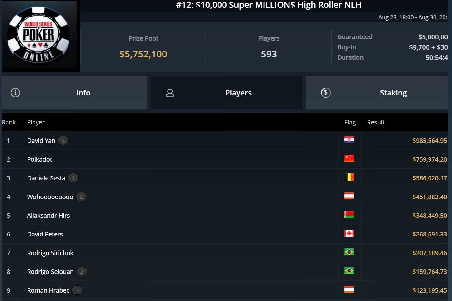 Bereits am Dienstagabend war Event #12 entschieden worden. Bei den $10k Super MILLION$ setzte sich in der Verlängerung der in Kroatien lebende David Yan durch und räumte sensationelle $985.000 ab.