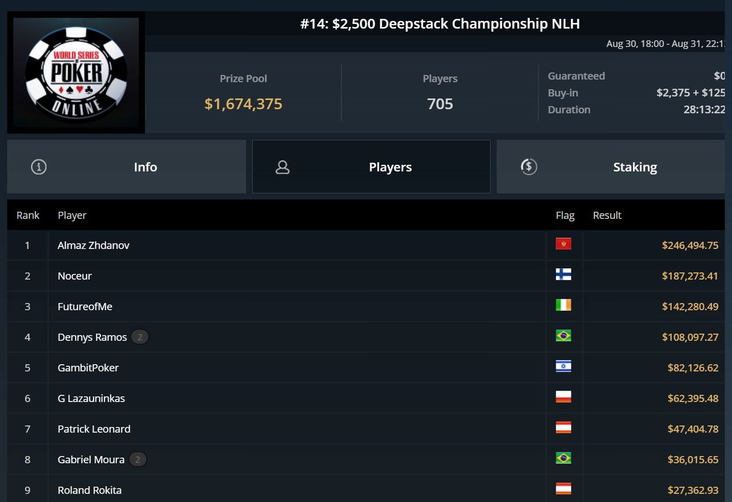 Bei Event #14, der $2.500 Deepstack Championship, triumphierte unter 705 Spielern der Montenegriner Almaz Zhdanov und kassierte ein Preisgeld von über $246.000.