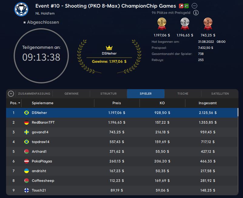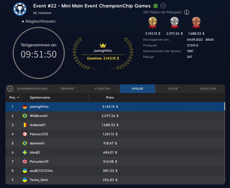 Ein paar Erfolge haben die deutschen Spieler schon gefeiert. Insbesondere joehighfritz, der sich den Sieg für $3.143,15 beim $16,50 Mini Main Event schnappte.