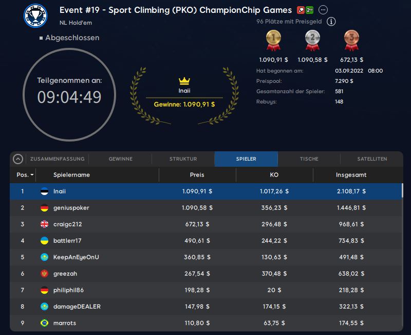 Außerdem belegten RedBaronTFT ($1.353,85) und geniuspoker ($1.446,81) zweite Plätze beim $16,50 Shooting PKO und $22 Sport Climbing PKO.