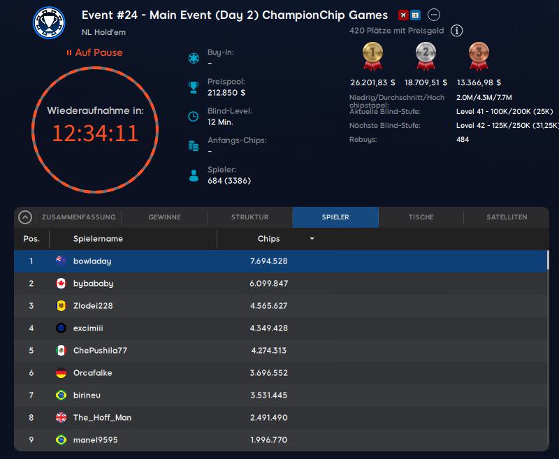 Am Montagabend starteten 684 Teilnehmer in den 2. Spieltag und es ging runter bis auf die neun Finalisten, die heute um den Titel und $26.201,83 Prämie spielen. Mit dabei ist der Deutsche Orcafalke, seine 3.696.552 Chips bedeuten Platz sechs. Die Führung hält der Neuseeländer bowladay mit 7.694.528 Chips.