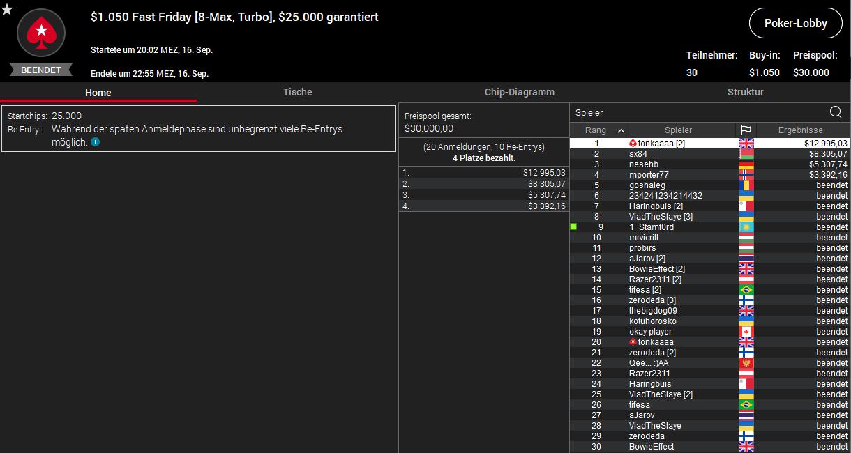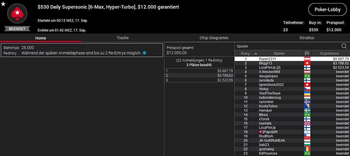 Einen Turniersieg landete auch Razer2311 aus Österreich beim $530 Daily Supersonic. Er bezwang Heads-up Bliggi13 ($3.788) aus der Schweiz und bekam $5.687 ausbezahlt.