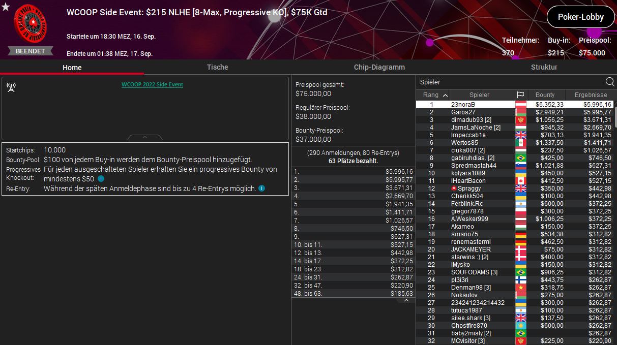 Aus deutschsprachiger Sicht lohnte sich der Freitag insbesondere 23noraB. Der Spieler aus Österreich gewann den WCOOP Side Event $215 NLHE PKO und kassierte $5.996 Prämie plus $6.352 an Bounties.