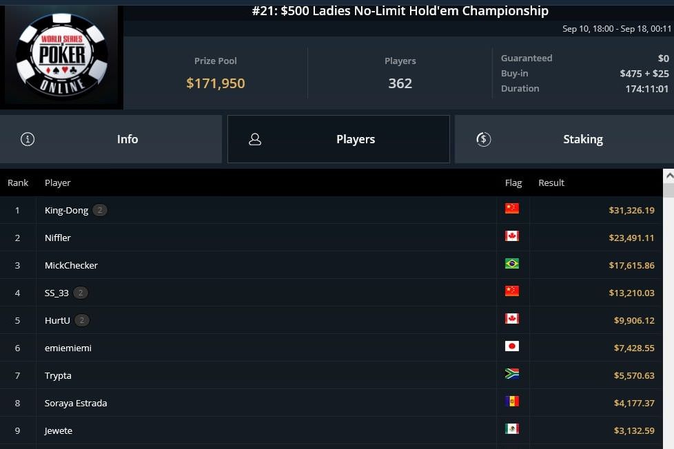 Das Damenturnier wurde von der Chinesin „King-Dong“ gewonnen. Sie setzte sich gegen 361 Konkurrentinnen durch und räumte ein Preisgeld von über $31.000 ab.